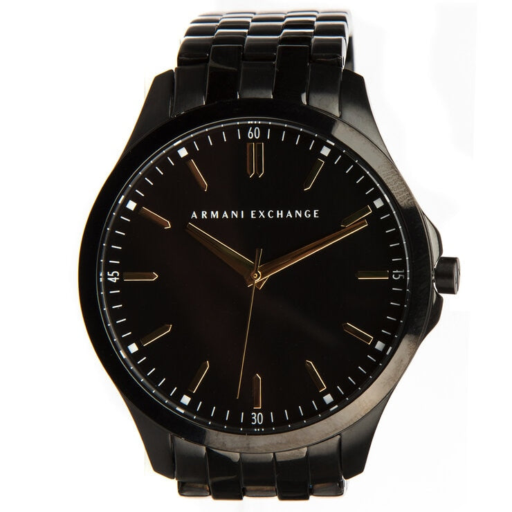 The Armani Exchange Hampton Black Watch AX2144 is a stylish and sophisticated timepiece with a sleek black dial, silver-tone hands, and index hour markers. It offers reliable quartz movement, a durable mineral crystal, and water resistance up to 50 meters. With its black stainless steel case and bracelet, it exudes elegance and versatility, making it suitable for both formal and casual occasions. Complete with a date function, it is a fashionable and reliable accessory that combines style and function. Its black and silver color scheme gives it a versatile appeal, allowing it to be paired with a variety of outfits.