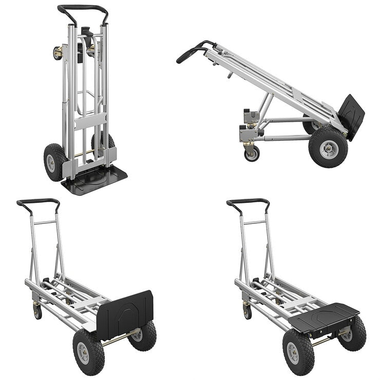 The COSCO Convertible Hand Truck 4 in 1, handles your heavy loads with ease. Easily converts with no tools or pins. Use it as a vertical or assisted hand truck to carry loads up to 362 kg. When you need help moving larger items, use the cart or platform cart for loads up to 453 kg. The folding toe plate allows for larger items to be easily transported. With this new all in 1 convertible hand truck, nothing gets left behind.This product features: