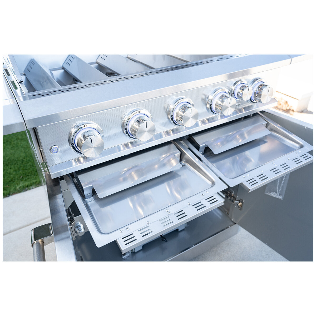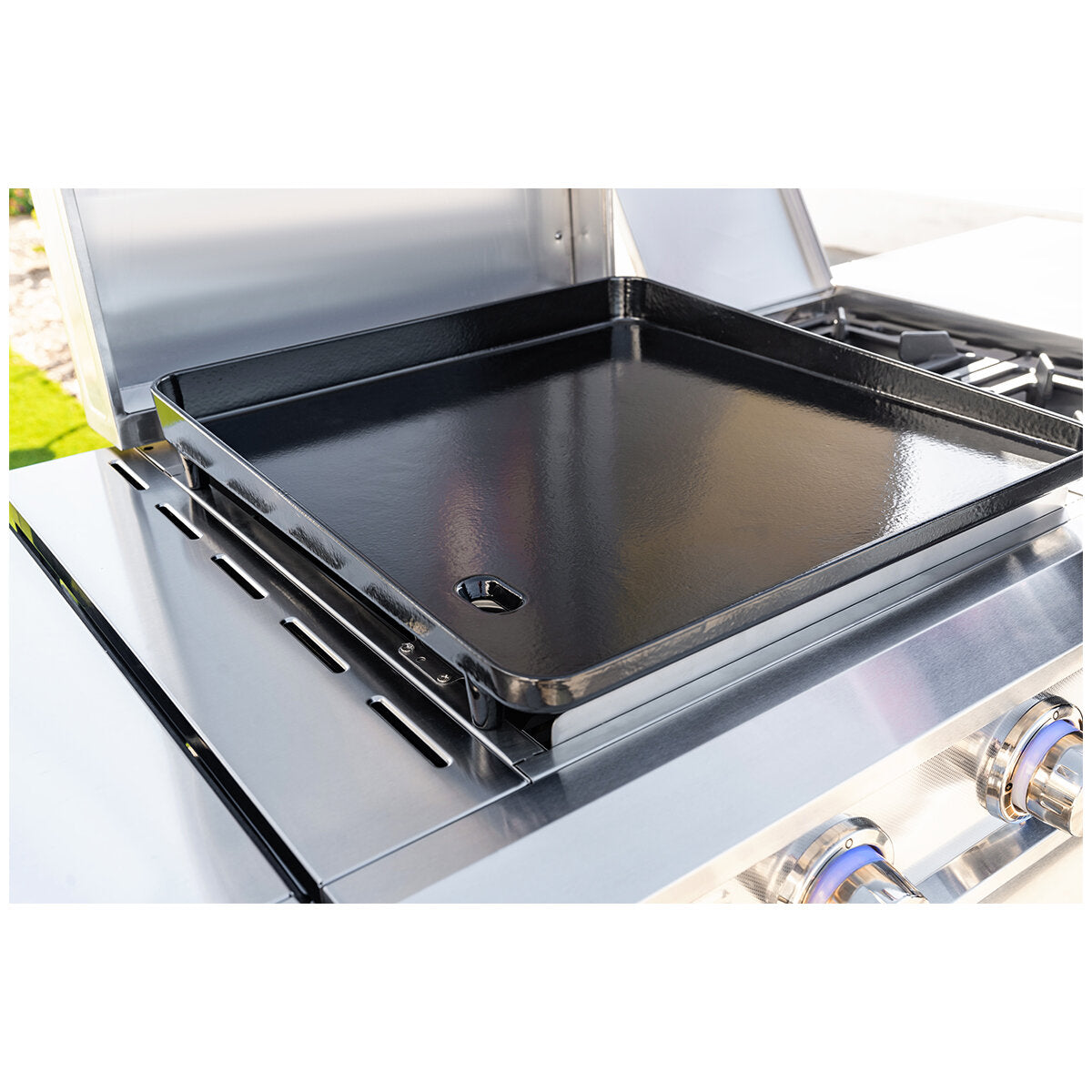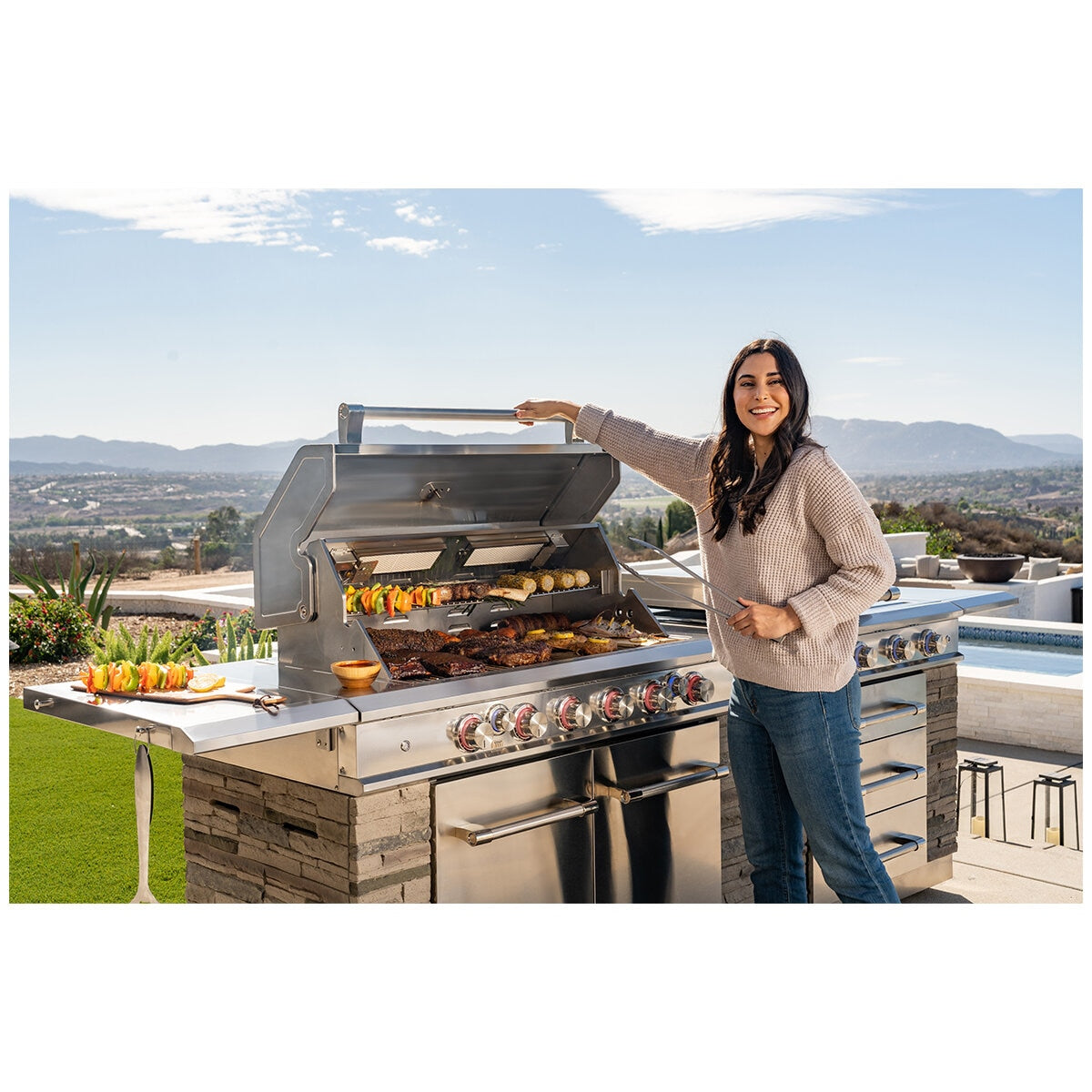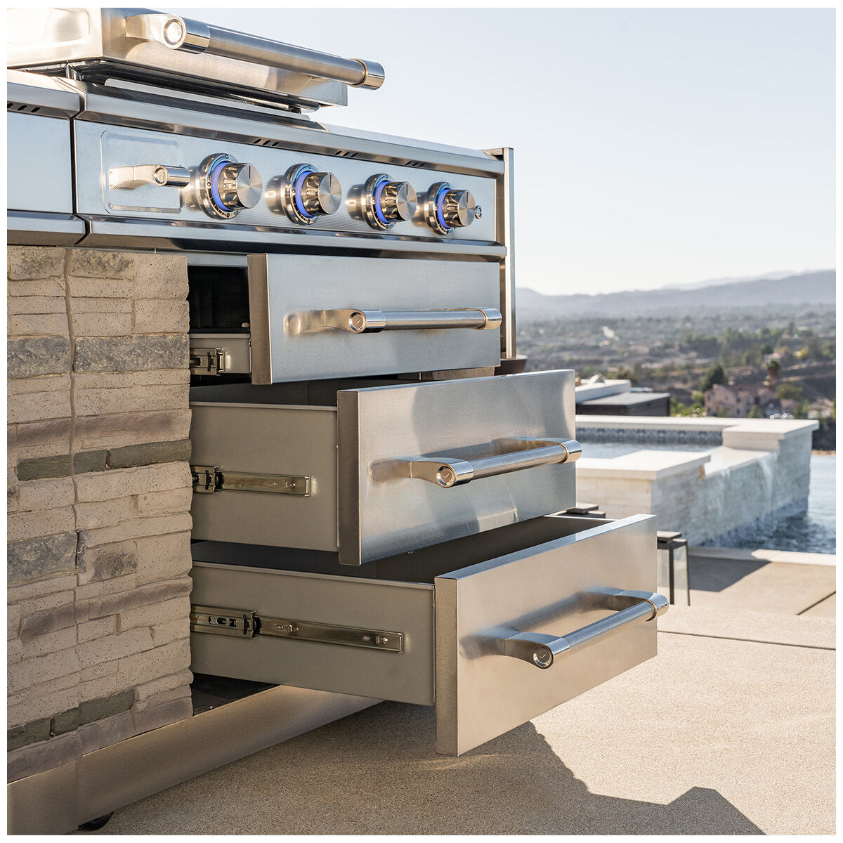 Built-in infrared top-searing burner lets you conveniently broil, caramelize, and sear foods to perfection. Battery-powered safety-minded LED knobs are blue when off and red when on (batteries included). Simple and accessible grease management system with removable, dishwasher-safe, grease trays. Reversible side burner cast iron cooking grids allow you to sear, sauté, and simmer – making them the ultimate grilling assistants for steaks, sauces, and side dishes. Built-in porcelain coated cast iron griddle offers durability, and easy cleaning – making it your new go-to station for griddling up all types of food. Three drawers with slow-close glides offer a convenient nearby location to store tools and other grilling accessories. Advanced Continuous Electronic Ignition System - battery operation allows you to turn and ignite the individual igniters for each burner (batteries included).