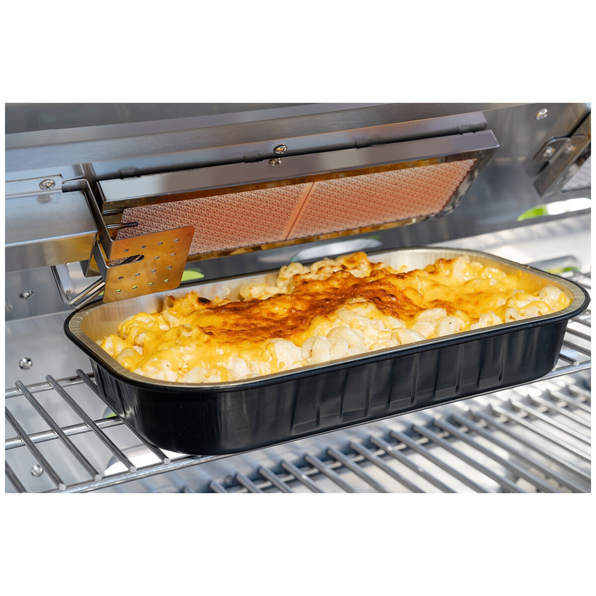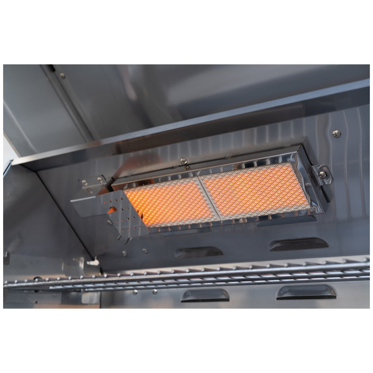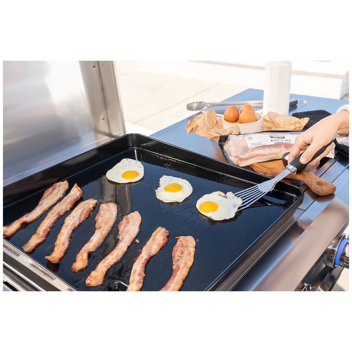 Built-in infrared top-searing burner lets you conveniently broil, caramelize, and sear foods to perfection. Battery-powered safety-minded LED knobs are blue when off and red when on (batteries included). Simple and accessible grease management system with removable, dishwasher-safe, grease trays. Reversible side burner cast iron cooking grids allow you to sear, sauté, and simmer – making them the ultimate grilling assistants for steaks, sauces, and side dishes. Built-in porcelain coated cast iron griddle offers durability, and easy cleaning – making it your new go-to station for griddling up all types of food. Three drawers with slow-close glides offer a convenient nearby location to store tools and other grilling accessories. Advanced Continuous Electronic Ignition System - battery operation allows you to turn and ignite the individual igniters for each burner (batteries included).
