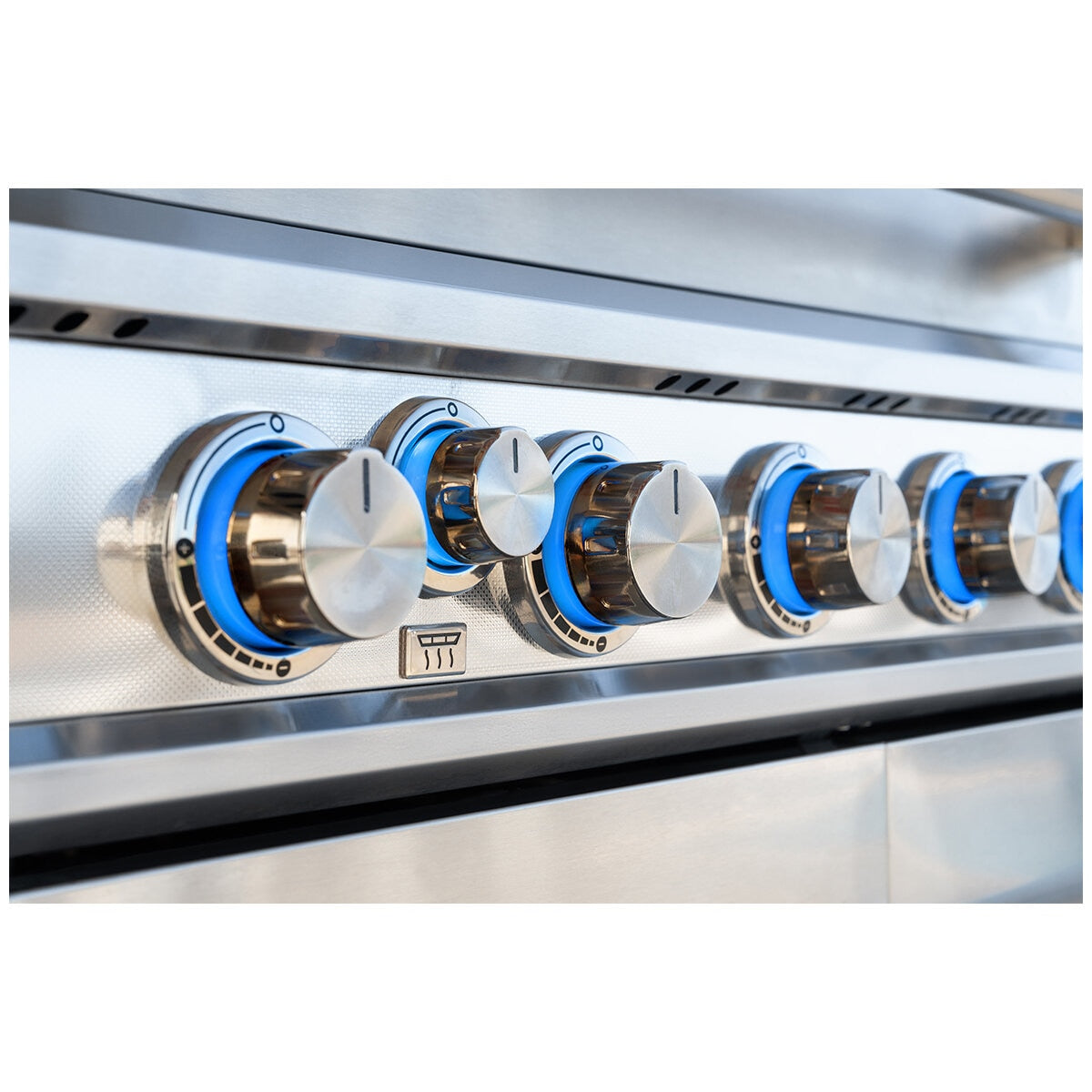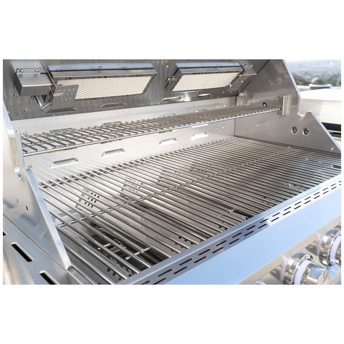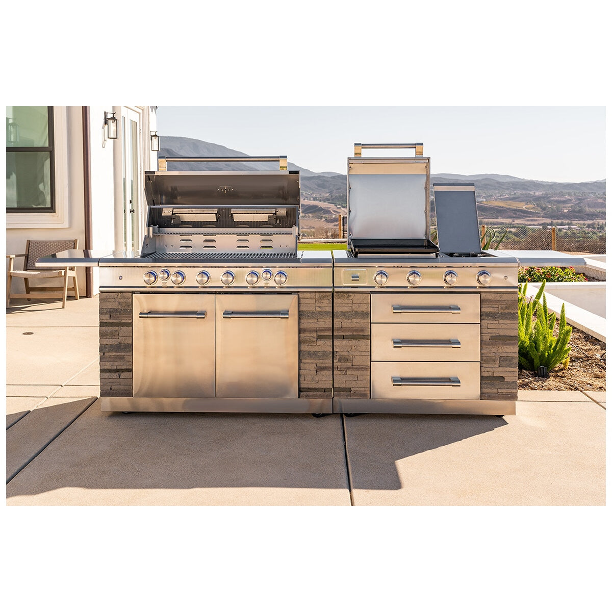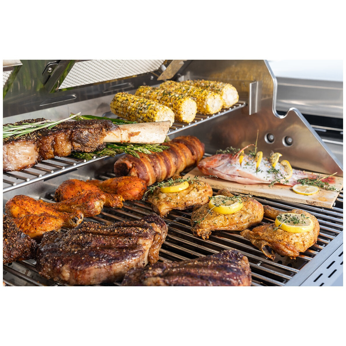 Built-in infrared top-searing burner lets you conveniently broil, caramelize, and sear foods to perfection. Battery-powered safety-minded LED knobs are blue when off and red when on (batteries included). Simple and accessible grease management system with removable, dishwasher-safe, grease trays. Reversible side burner cast iron cooking grids allow you to sear, sauté, and simmer – making them the ultimate grilling assistants for steaks, sauces, and side dishes. Built-in porcelain coated cast iron griddle offers durability, and easy cleaning – making it your new go-to station for griddling up all types of food. Three drawers with slow-close glides offer a convenient nearby location to store tools and other grilling accessories. Advanced Continuous Electronic Ignition System - battery operation allows you to turn and ignite the individual igniters for each burner (batteries included).