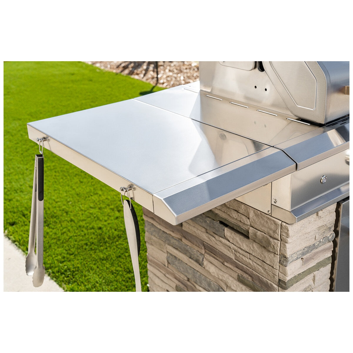 - Stainless steel foldable side shelves with tool hooks, collapse to free up even more patio space