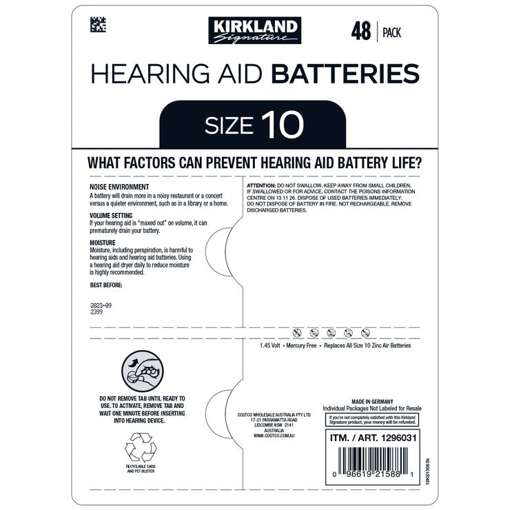 Kirkland Signature’s zinc air batteries use air as a source of power, and the tab provides a seal that ensures freshness until the battery is ready for use. The packaging allows for easier installation, large tabs provide ease of use and handling, dials provide secure and convenient transport, and they’re mercury free.