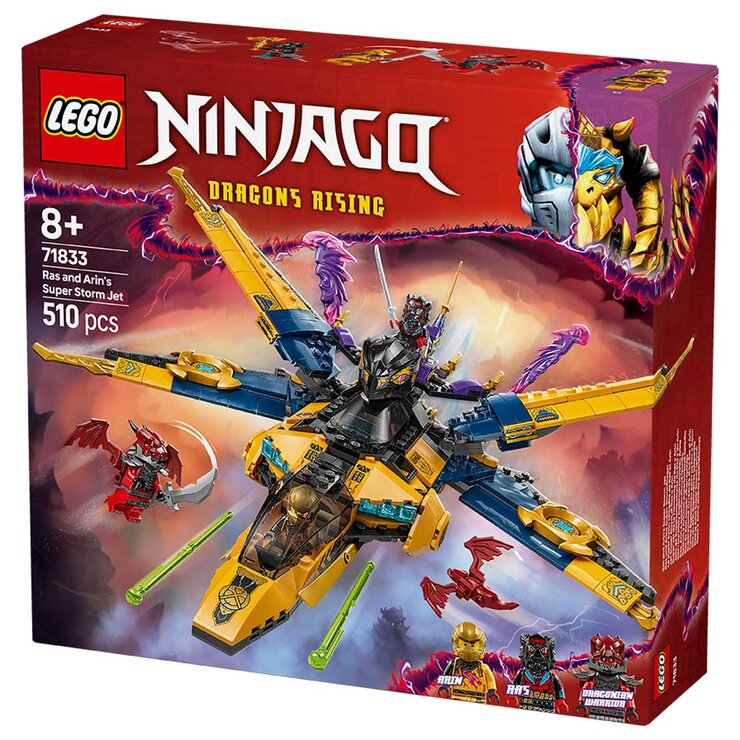 Boys and girls aged 8 plus can recreate scenes from season 3 of the NINJAGO Dragons Rising TV show with Ras and Arin’s Super Storm Jet 71833. Featuring a cool jet toy with a detachable drone and escape pod, plus Arin, Ras and Dragonian Warrior minifigures and a mini dragon critter model, this incredible LEGO building set comes with all kids need to enjoy countless hours of role play.The stunning action toy comes with a detachable dragon headed drone toy with removable blades and engines to be used as weapons, 2 cockpits, including one that can be detached as a flying escape pod with wings, 2 spring loaded shooters, adjustable wings and swirling storm blades.