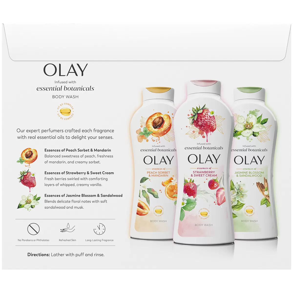 Smell irresistible all day with the new fragrances of Olay Essential Botanicals Body Wash. Choose between three delicious scents crafted with real essential oils by Olay perfume experts that will delight your and everyone else’s senses. Lather with jasmine blossom and sandalwood for a delicate blend of musk and floral notes. If you’re into berry sweet scents, strawberry and sweet cream will have you feeling like a dessert. Try peach sorbet and mandarin for a perfectly balanced punch between fresh, sweet and fruity. All Olay Essential Botanicals Body Washes are moisturising, free of parabens or phthalates and infused with Vitamin B3 complex, exceptionally ideal for dry skin. No matter your choice of fragrance, Olay Essential Botanicals Body Wash will leave you smelling exquisite and looking radiant all day. At Olay, they are serious about our commitments. Olay skin promise to you is zero skin retouching in all advertising. Olay is the first mass skin care brand in the U.S. to take this stance because Olay know real beauty is honestly beautiful.Olay Fall Essentials Botanicals Body Wash. Peach Sorbet and Mandarin, Strawberry and Sweet Cream, Jasmine Blossom and Sandalwood 700 ml.