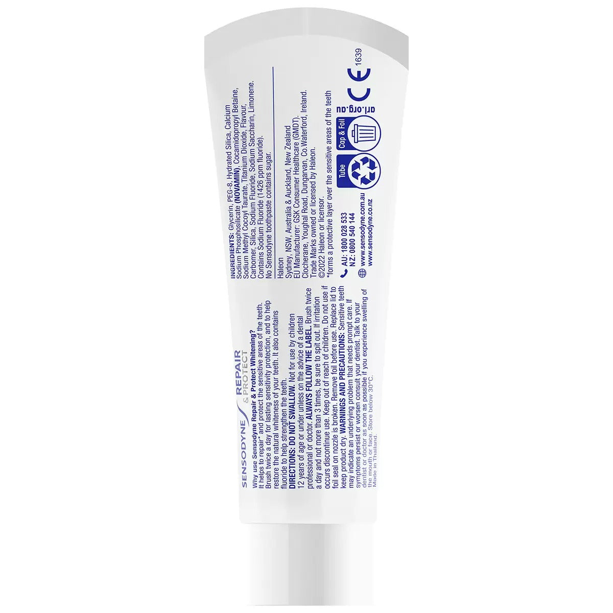 Sensodyne Repair and Protect Deep Repair* toothpaste is a daily fluoride toothpaste. Its active ingredient, NovaMin, is a Calcium Sodium Phosphosilicate formulation, which with twice daily brushing, helps repair* sensitive teeth. It also helps form a protective layer over the sensitive areas of the teeth. Sensodyne Repair and Protect Deep Repair* helps provide effective lasting relief** from the twinge of sensitivity and contains fluoride for everyday cavity protection whilst helping restore the natural whiteness of your teeth*. Forms a protective layer over the sensitive areas of the teeth. Brush twice a day for lasting sensitivity protection**.Ingredients