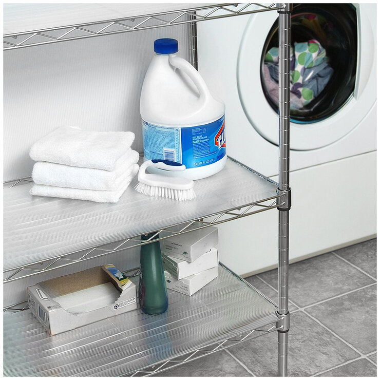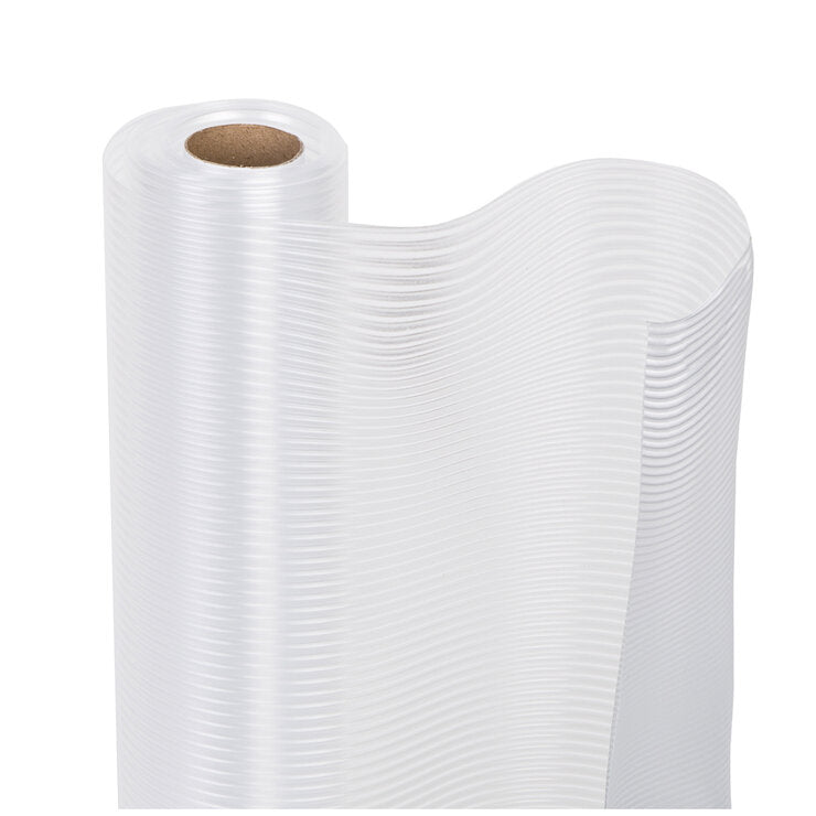 Protect your valuables from slips and spills with this eco-friendly shelf liner! Made from durable, non-toxic EVA material, the liner is gentle on surfaces and provides protection for your furniture. The ribbed surface helps to keep items in place, while the non slip bottom tightly grips to your shelves. It's food safe, easy to use and you can simply cut it as desired or wipe it when needed. It's the ideal lining for food cabinets, garages and drawers.This product features: