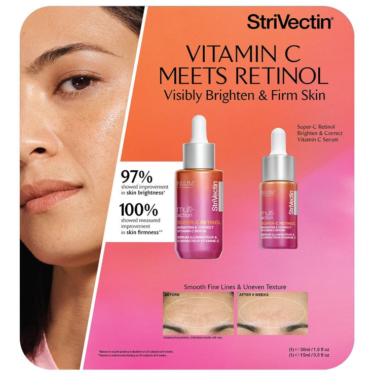 Together at last, the brightening power of Vitamin C and the correcting power of Retinol are combined in a lightweight serum. This product features two forms of stabilised Vitamin C and Acerola Cherry Extract to restore clarity and brighten dull, tired skin. Retinol helps to smooth rough texture and fine lines while helping to neutralise the effects of free radicals to skin. It is further enhanced by NIA-114, StriVectin’s proprietary form of Niacin, to strengthen the skin barrier for a more renewed, glowing complexion.This product features: