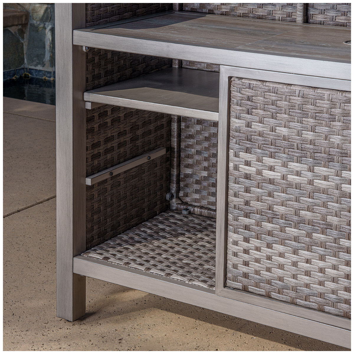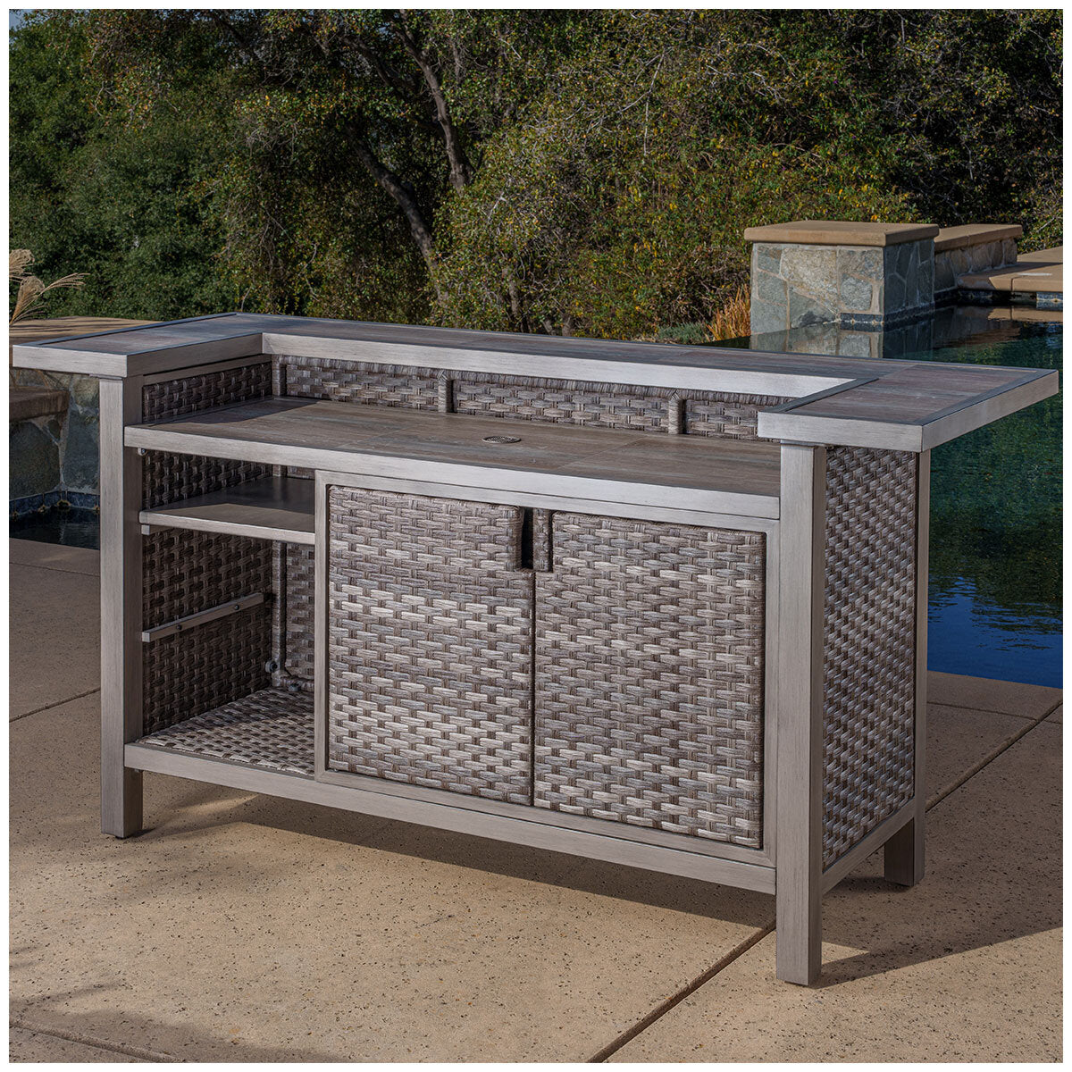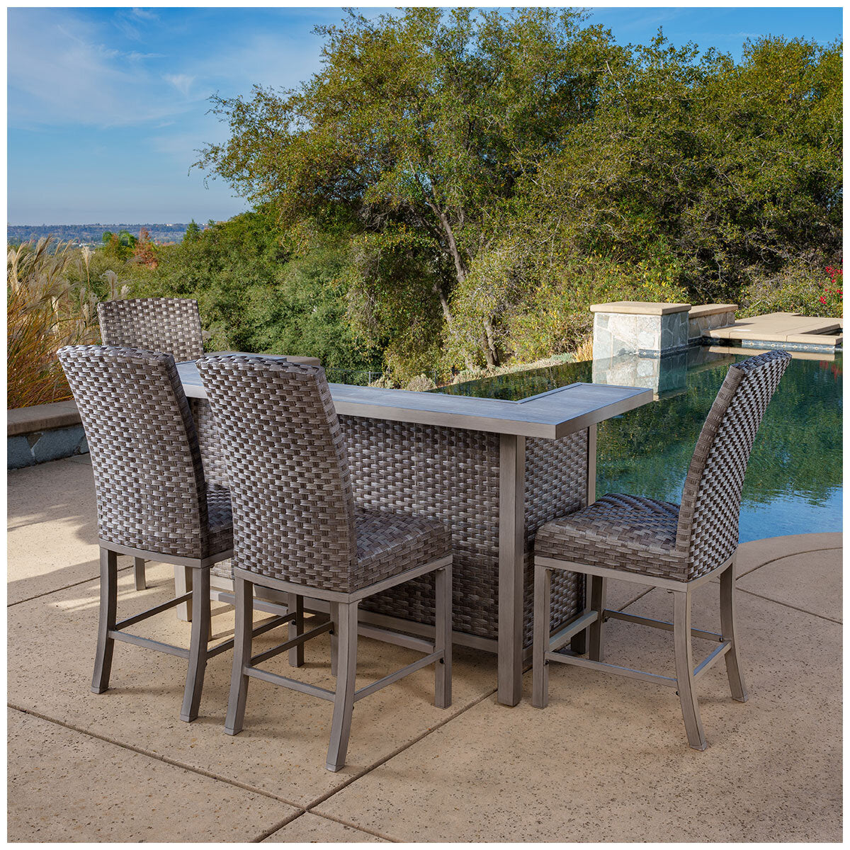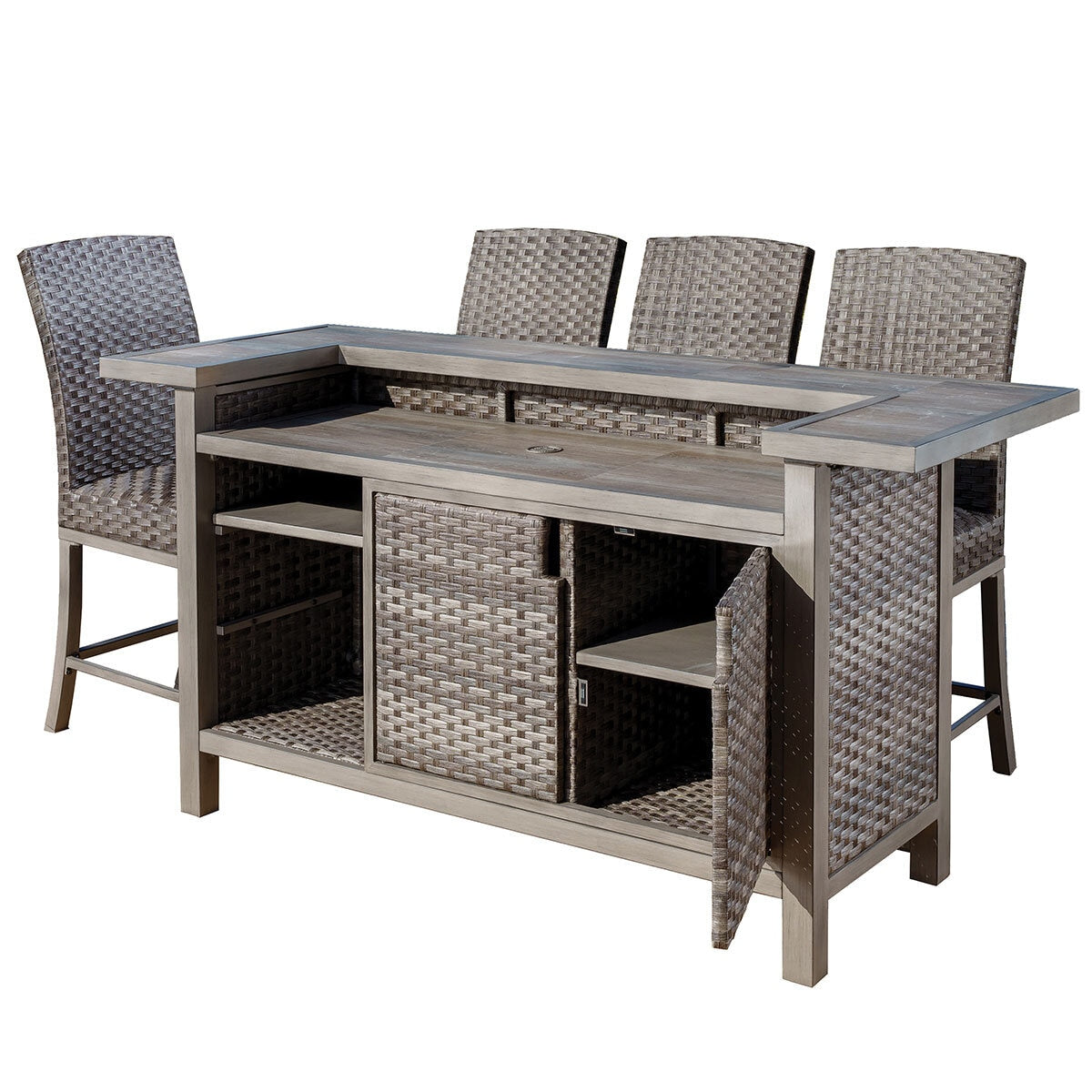 Transform your backyard into the envy of the block with the Taylor 5 Piece High Dining Bar Set from SunVilla. With its four chairs included, guests and hosts alike will enjoy gathering around the bar to enjoy refreshments or great conversations.A barkeep's dreams lie just behind the u-shaped serving counter. An open, adjustable shelf is accompanied by storage cabinets to hold all the necessities you need to keep the good times rolling while staying organized. The durable and nonporous tiled prep counter offers ample space to work your magic and show off your knife skills.