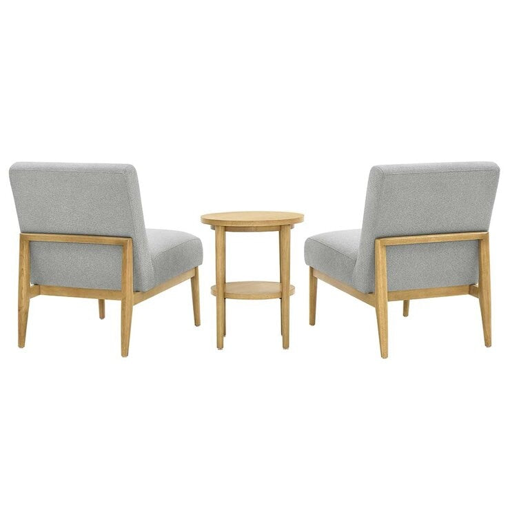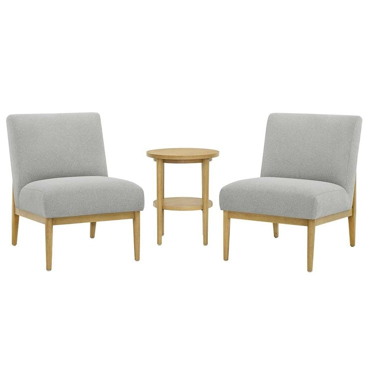 Introducing a touch of sophistication with the Thomasville 2 Piece Fabric Accent Chairs and Side Table Set. Designed to seamlessly blend into any décor, this set brings a refreshing simplicity that lights up any room. Featuring two sleek, armless chairs upholstered in soft, durable 100% polyester fabric, each piece invites you to sit back and relax in comfort.The chairs boast a smooth back design set atop high tapered legs, offering a modern twist on classic elegance. The accompanying side table, finished in a natural wood, complements the ensemble with its clean, crisp lines. This set not only promises style and comfort but also serves as a functional centrepiece in your living room, bedroom or cozy nook. Transform your space into a stylish haven with the timeless charm of Thomasville.