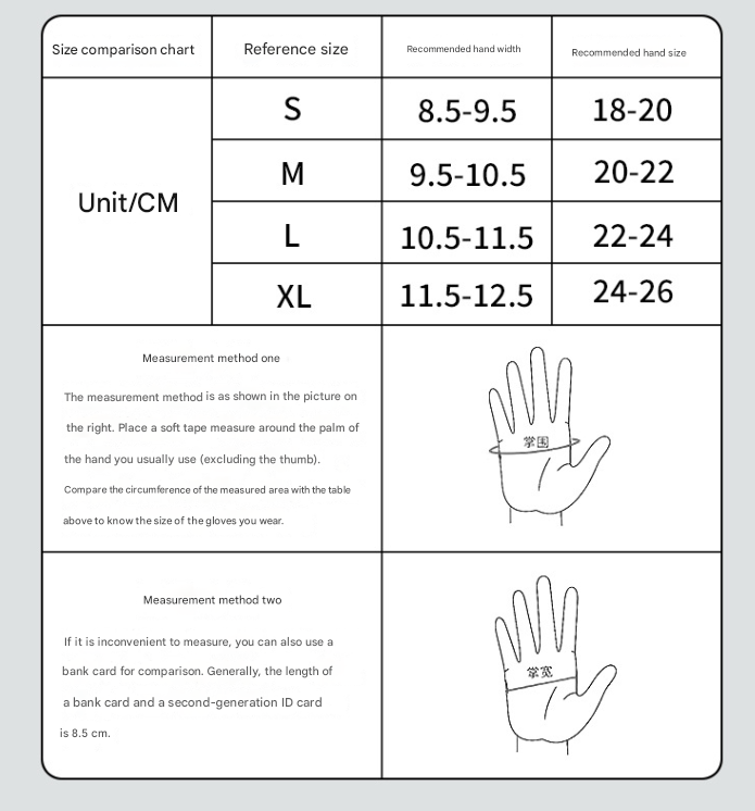 Note: To ensure maximum comfort and performance, please carefully measure your hand circumference and compare it to the sizing chart before making your purchase.