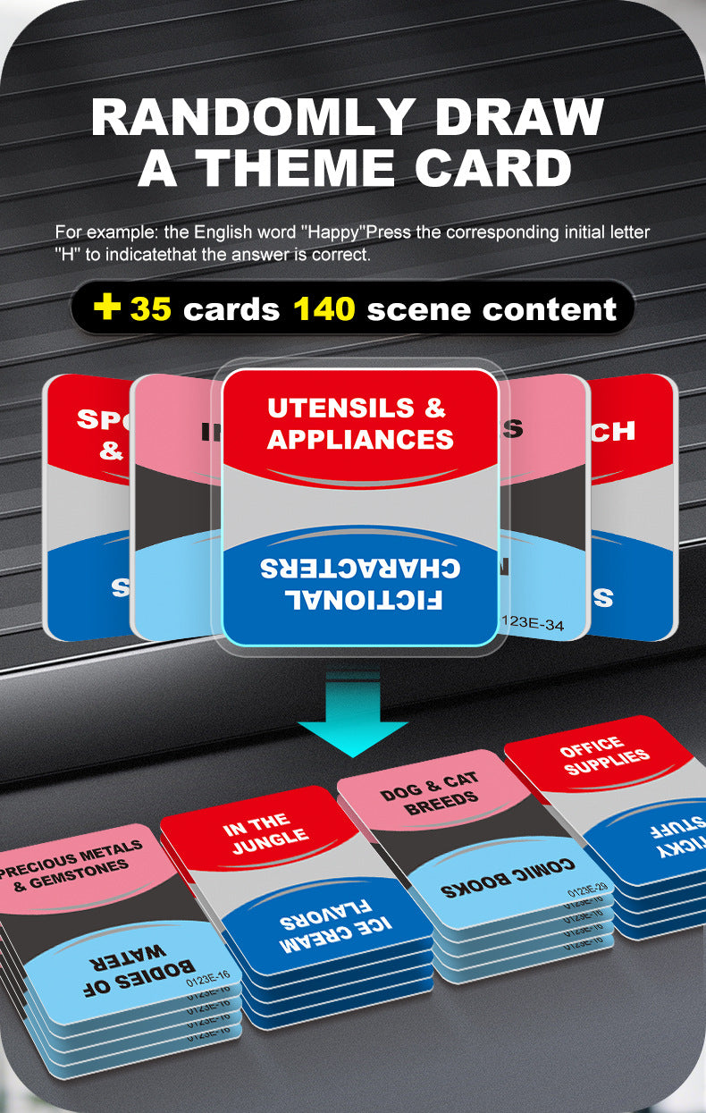 Get ready for a fast-paced and exciting word challenge with the Alphabet Game! This electronic tabletop game is perfect for parties, family game nights, and educational fun. Players race against a 10-second countdown timer to name an item that fits a randomly selected category and starts with an available letter on the board. With 24 letter keys and an upgraded IC containing 220 scenarios, the fun is endless. The game also includes 35 theme cards with 140 scene contents for an alternative way to play. Featuring two engaging modes -C Category Quick Answers Mode and Step on Thunder Mode -C this game tests your quick thinking and vocabulary in a thrilling way. If a player fails to answer in time, they are eliminated, adding to the excitement.