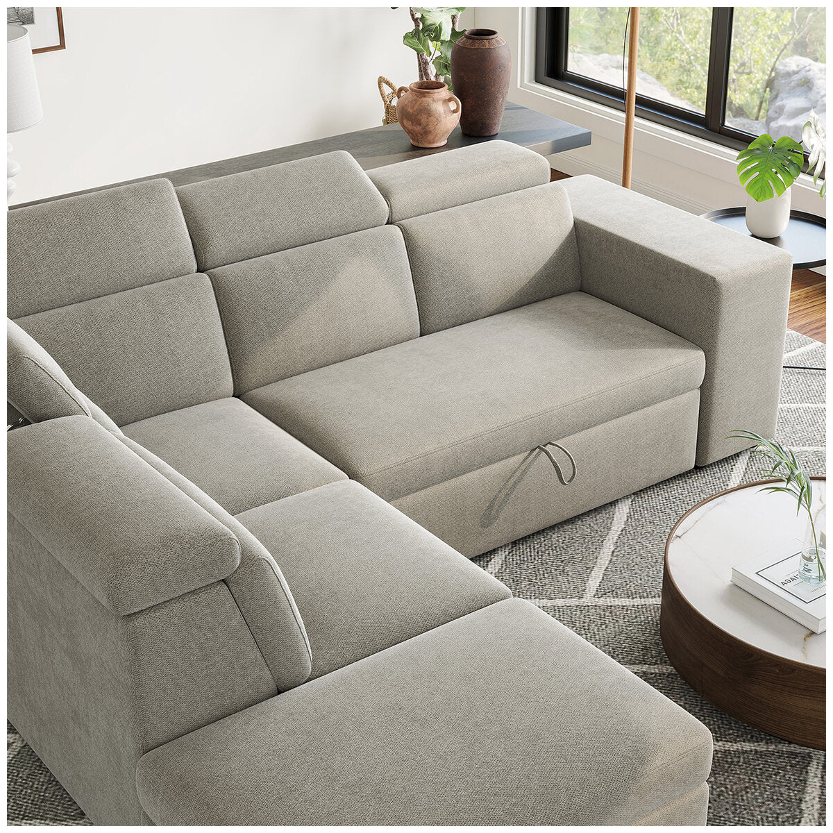 This fabric couch boasts a host of hidden features built in hidden storage, two additional bar seats and a pull out bed. With the ample storage space conveniently tucked away beneath the seat, you can declutter your living area and keep essentials within easy reach. If you need additional seating, you can easily pull out the bar seats to give more guests a place to sit. If the need arises, you can then easily transform the Finn fabric sectional lounge into a comfortable bed, accommodating overnight guests with ease. Embrace the versatility and beauty of the Finn and elevate your living space to new heights of style and practicality.